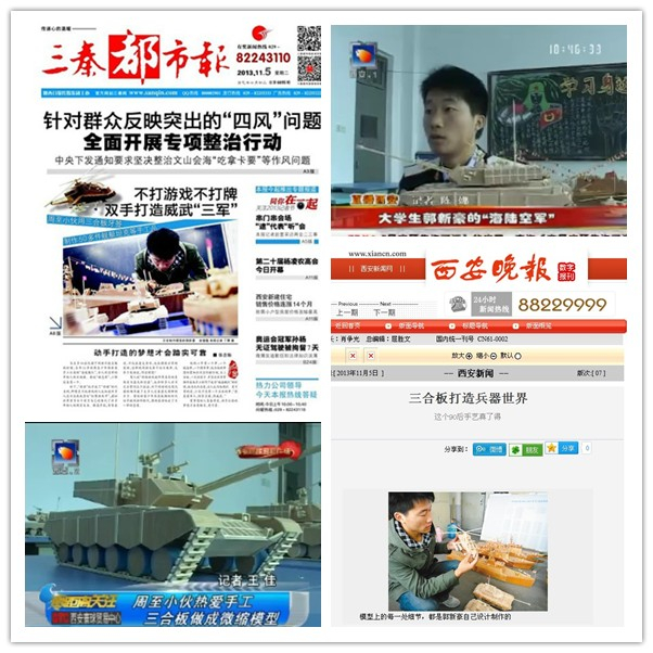 11月4日,《三秦都市报》和《西安晚报》的记者分别来我院进行采访。11月5日,《三秦都市报》在头版以《不打游戏不打牌 双手打造威武“三军”》为题配图报道,并配以《动手打造的梦想才会踏实可靠》的专题评论。《西安晚报》以《三合板打造兵器世界》为题进行了配图报道。