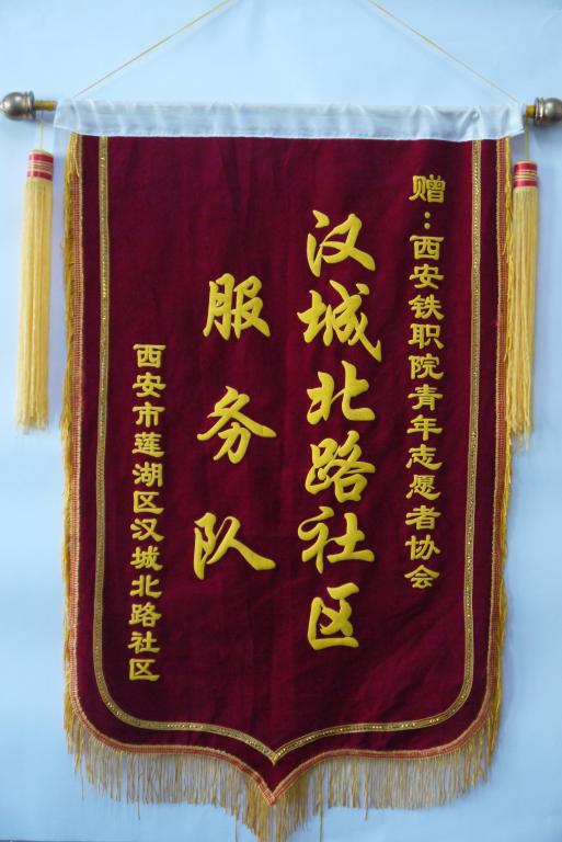 本届青年志愿者协会从10月份成立以来,就以各分队为单位分别到汉城北路社区、金秋老年公寓、红砖南路社区、邓家村老年公寓、博瑞养老院、心心幼儿园、公交公司等地持续进行志愿活动。11月18日,莲湖区汉城北路社区赠予学院志愿服务队一面锦旗,汉城北路社区负责人对志愿者们热情周到的服务表示非常感谢,希望同学们能继续发扬并继承这种优秀的志愿服务精神,为社会奉献自己的光和热。