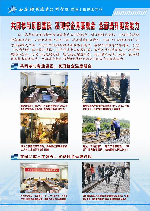 11月中旬,陕西省教育厅、财政厅对我院“高等职业学校提升专业服务产业发展能力”铁道工程技术专业建设项目进行了省级验收,并将“共同参与项目建设,实现校企深度融合,全面提升服务能力”的专业建设做法,作为陕西省典型案例上报教育部和财政部。日前,该项目又通过了两部验收,两部充分肯定了该专业典型案例中总结的专业建设做法,将其确定为“全国高等职业学校提升专业服务产业发展能力”项目建设经验交流与成果展示的典型案例之一,参加了12月下旬在广州顺德举办的经验交流与成果展示会。