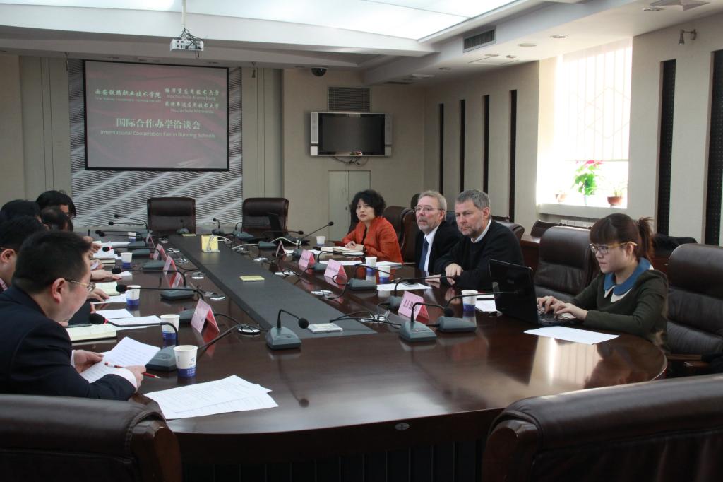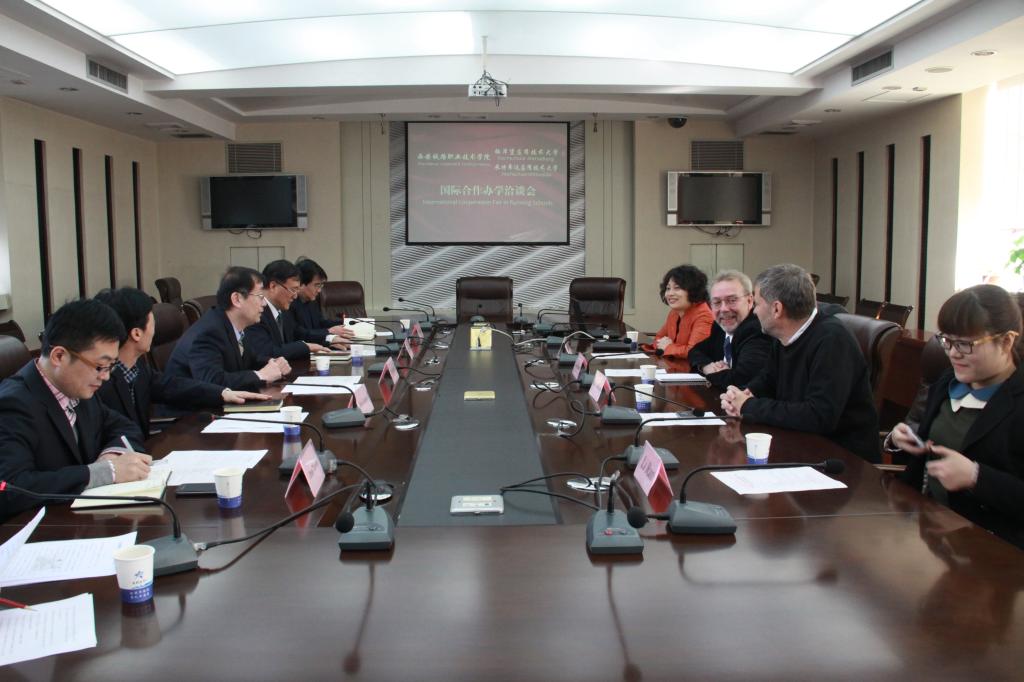 通过省教育厅国际合作与交流处孙建宁处长的引荐和前期沟通,该两校代表专程来我院,就联合办学事宜进行洽谈和磋商。经过两个多小时的充分交流与沟通,双方就实施“3+2”合作模式和选择合作专业的可行性达成共识。并就国际合作办学有关政策进行了交流。