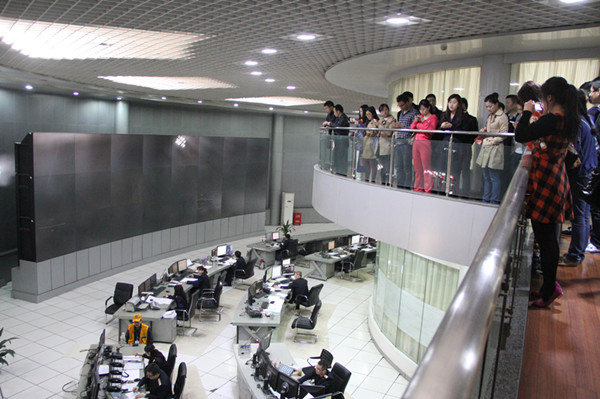全体教师参观了车站模型式、调度指挥中心、室外驼峰峰顶平台作业场所。双向纵列式三级七场的规模让大家叹为观止;先进的SAM系统,集编组站溜放速度控制、进路控制、车辆管理、信息管理、决策管理等为一体,实现了解体计划自动接受、进路自动排列、雷达测速、测长等强大功能,使驼峰溜放作业除提钩作业外真正实现自动化;一辆辆摘挂车辆从峰顶平台溜放至股道的作业过程让大家目不暇接。