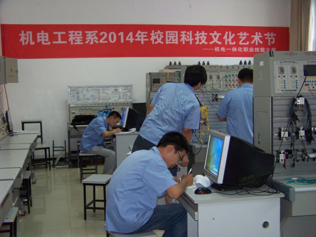 6月5日下午,机电工程系组织325112班机电一体化技术专业的学生在液压气动实训室举行“机电一体化系统安装调试技能”比赛。作为机电工程系2014年校园科技文化艺术节机电一体化职业技能大赛其中的一项,比赛要求学生在规定时间内完成气动回路设计、控制电路设计,按要求完成气动回路、控制电路连接和调试。比赛分四组进行。最终评出一等奖一组,二等奖两组,三等奖一组。