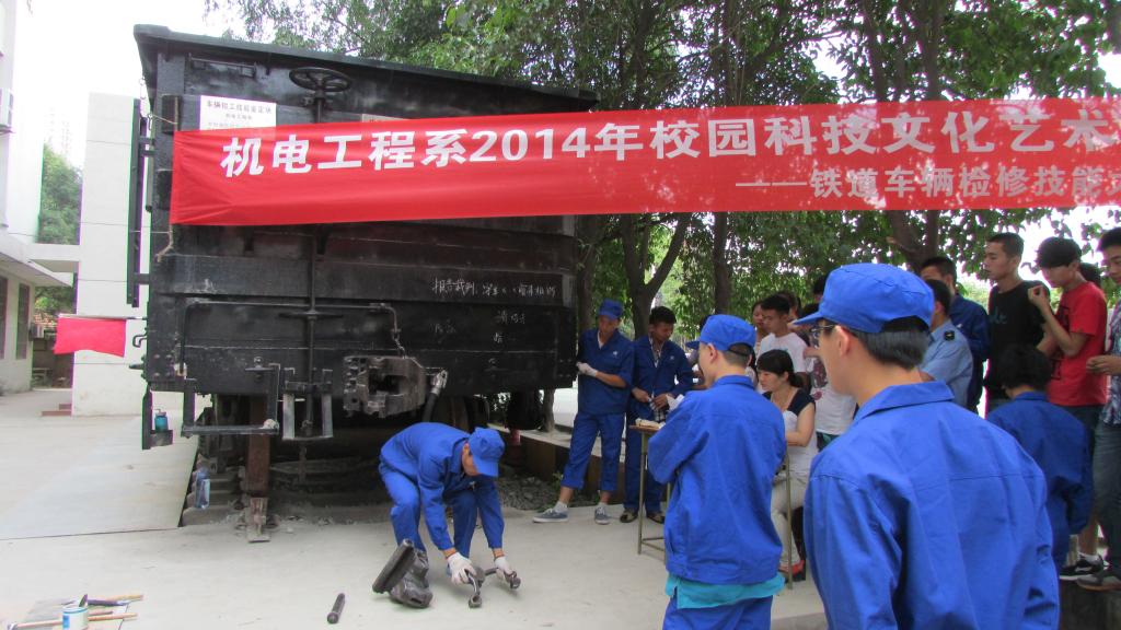 6月10日下午,由机电工程系铁道车辆教研室组织铁道车辆专业学生在铁道车辆检修练功场,举办了机电工程系2014年校园科技文化艺术节活动之一的铁道车辆职业技能大赛 “铁道车辆检修技能”项目比赛。比赛要求学生在最短时间内完成13号车钩的分解,各零部件的清洁、检查、给油,车钩组装、三态试验,开锁位、全开位测试,车钩防跳检查等项任务。比赛过程由每个参赛选手独立完成。比赛评分按时间分和质量分各占50分,两项合计计算选手得分。