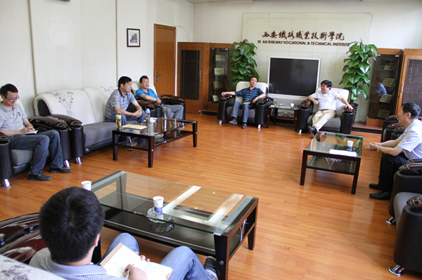7月3日上午,绥德电务段副段长王刚刚、劳人科科长王永强、职教科科长姚玉祥一行三人,宝鸡供电段劳人科科长董廷玺、职教科科长李海峰等一行五人,来学院商谈2015届西安铁路局签约学生顶岗实习工作,副院长翁谦锁出席会议。