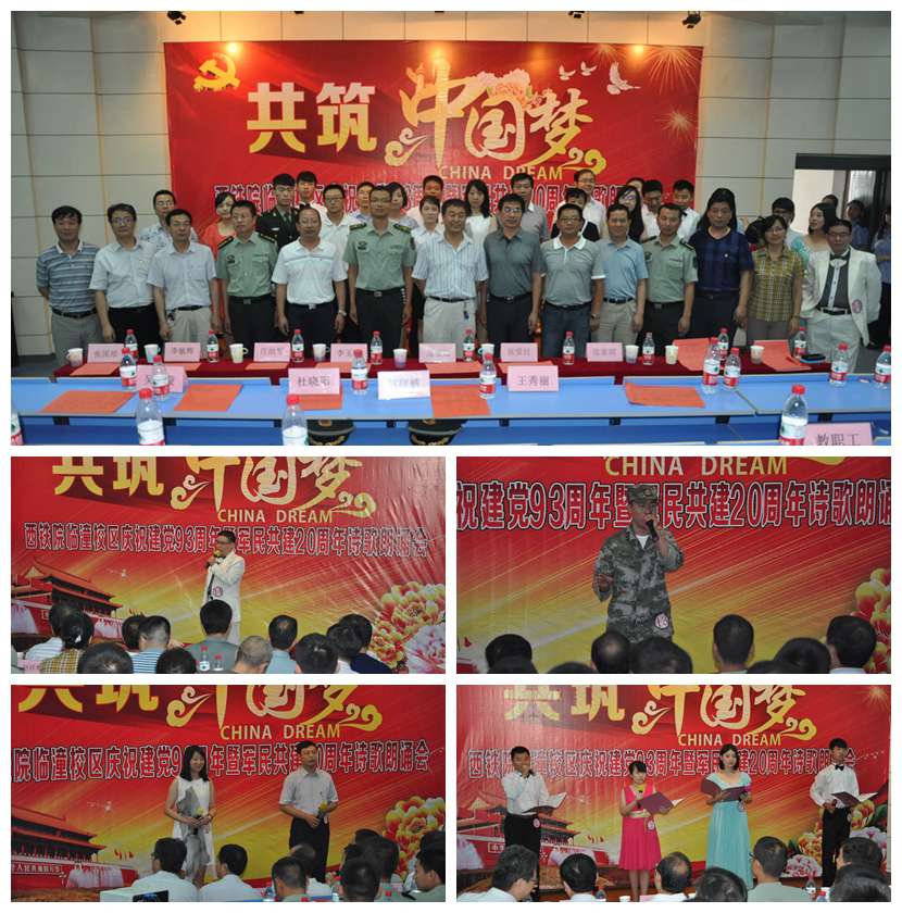 为缅怀党的光辉历程,讴歌党的伟大成就,6月30日,在党的生日到来之际,临潼校区全体教职工和68310部队装备部修理营20余名指战员代表们欢聚一堂,举办“共筑中国梦”诗歌朗诵会活动,热情抒发爱党情怀,共同庆祝建党93周年,并隆重纪念军民共建20周年。