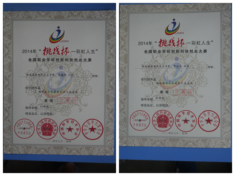 7月25日至29日,2014年“挑战杯——彩虹人生”全国职业学校创新创效创业大赛终审决赛在杭州举行。我院机电工程系刘明玺、邹俊俊老师分别指导学生设计的《新型复合式数控机床主轴系统》和《端面驱动式高精度车床夹具》两件作品荣获全国二等奖,院团委荣获校级优秀组织奖。