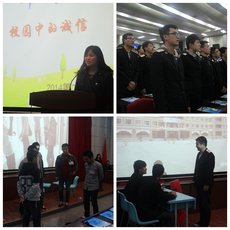 在“道德思考”环节,主持人通过广西南宁市罗凤村“无人菜市场”的故事向在场师生生动传达了社会中的诚信榜样,诠释了诚信的力量;在“省心”环节,全体师生在主持人的引导下对校园中的不诚信现象进行了反思;在“唱道德歌曲”环节,全体学生合唱歌曲《做个诚信人》,用歌声表达出对诚信的认同;在“讲道德故事”环节,学生代表通过自编自演的《校园情景剧——吸烟篇》、《应聘篇》为我们讲述了发生在大学生中的不诚信事件;在“诵经典”环节,主持人带领大家一起诵读了《河南程氏遗书》中有关治学和诚信的经典段落,接受经典的洗礼;在“做道德承诺”环节,每位学生将写有自己道德承诺的便签投入道德承诺箱,郑重承诺在各方面严格要求自己,杜绝不诚信事件在自己身上发生,使校园真正成为一片净土。
