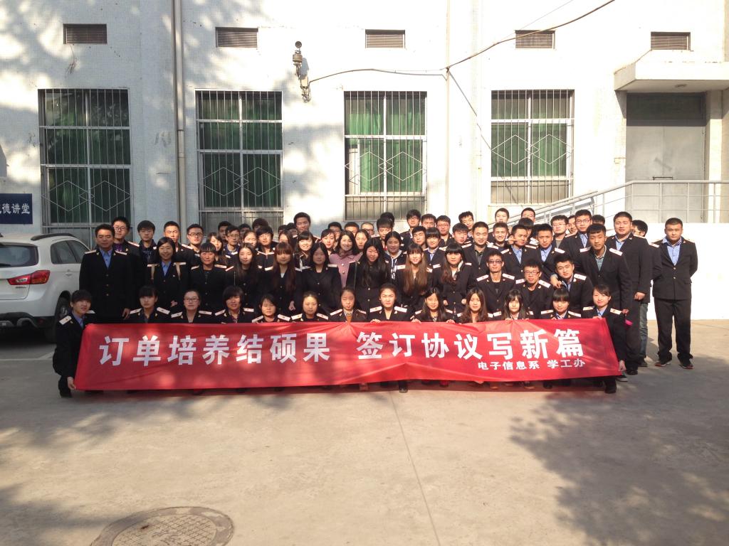 就业签约是大学生就业工作中的一个重要环节,一方面标志着用人单位认可校方订单培养的人才,另一方面标志着订单班学生完成从预录学生到准员工的转变。电子信息系自从成立西安地铁订单班后,重视对订单班人才培养工作,在教学上不断创新人才培养方案,紧贴岗位需求进行授课教学;在日常管理上,依照《学院签约学生管理办法》,用高标准严格要求管理学生,使学生自觉的养成时间观念,纪律观念和过硬的作风。