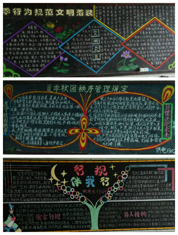 黑板报是班级活动宣传的阵地,它既可以沟通学生与班级的联系,又可以帮助学生增加知识,活跃学生的生活,对于促进学生的健康成长有非常重要的作用。近期电气工程系举办了以“夏季校园秩序管理规定”为主题的黑板报比赛,为了创造良好的夏季学习生活秩序,使学生养成良好的行为习惯,以保证学习任务的顺利完成。经过评选,电气自动化1301班获一等奖;供用电1302班、供用电1304班获二等奖;022305班、022304班、电气自动化P1601获三等奖。
