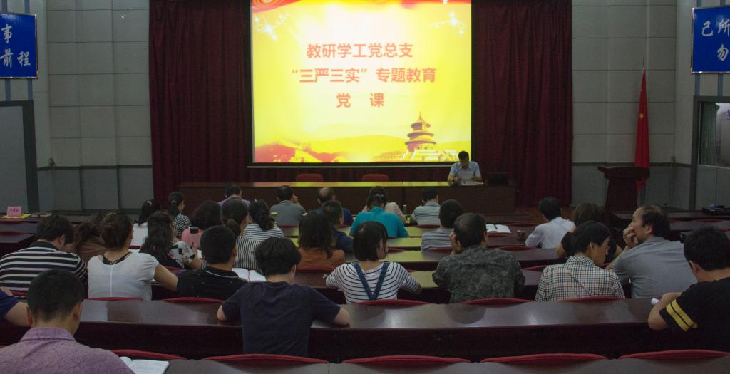 6月17日下午,教研学工党总支在阶梯教室召集总支全体党员和入党积极分子40余人,组织了“三严三实”专题教育党课,启动了教研学工党总支的专题教育工作。教研学工总支书记滕勇带头讲党课,并对总支的专题教育工作进行了安排部署。