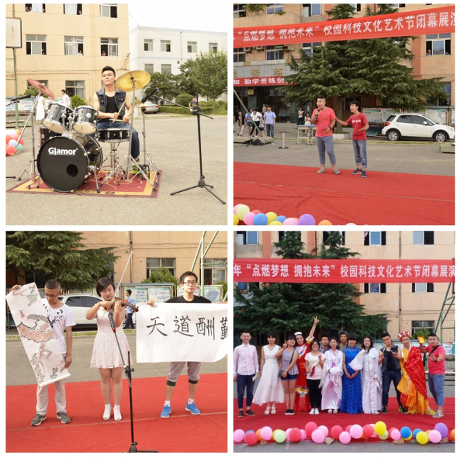 本届校园科技文化艺术节以“点燃梦想 拥抱未来”为主题,按照“注重实效、体现特色、普遍参与、打造精品”的原则,分别开展了主题教育类、文化展示类、体育趣味类三大类活动。在活动中陆续开展了重温2014年习近平总书记在北京大学的讲话精神、社会主义核心价值观教育、“低碳环保践行创新” 手工艺作品大赛、 书画、剪纸作品展、诗歌朗诵、时尚模特秀、象棋大赛、乒乓球、羽毛球比赛、轮滑表演等15项活动,直接参与学生人数571人,间接参与学生人数为2800人次,所有活动均由学生干部组织、策划。为同学们充分展示自我、传递正能量、实现青春梦想,打造了一个广阔而绚烂的青春舞台。