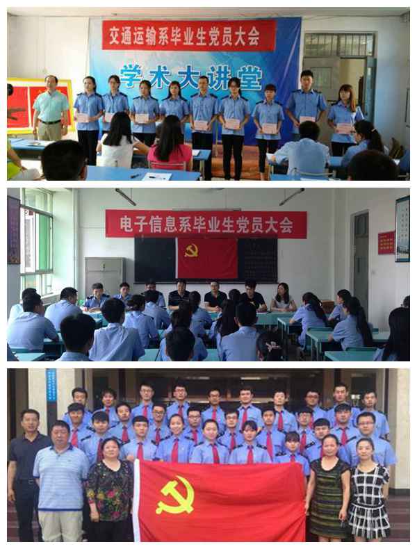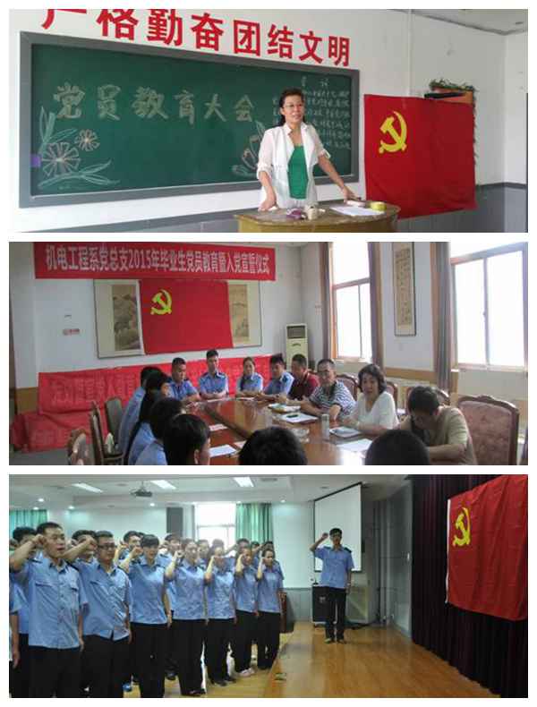 各总支还认真组织了新党员入党宣誓仪式,全体预备党员站在党旗下进行了庄严的入党宣誓,老党员重温了入党誓词。各党总支为新党员颁发了学院党委组织部为新党员制作的预备党员通知书。宣誓仪式上各党总支负责人对所有参加入党宣誓的新党员提出了明确要求和希望。交通运输系党总支利用毕业生党员教育大会开展了党员正确的就业观教育;电子信息系党总支召开了毕业生党员大会, 围绕“三严三实”专题教育活动,强调了毕业生党员要发挥党员先锋模范作用,在各自的岗位中建功立业;电气工程系党总支开展了毕业生党员民主生活会,毕业生党员交流了实习期间的经历; 牵引动力系党总支开展了“我为总支添光彩”的专题教育活动; 机电工程系党总支举办了毕业生党员教育暨新党员入党宣誓大会;临潼校区党总支组织毕业生党员开展了理论学习集中教育和入党宣誓仪式,强调毕业生党员理论知识的掌握,覆盖率达到100%。