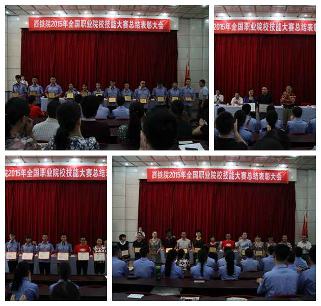 黄家昌宣读了《西安铁路职业技术学院关于表彰2015年全国及陕西省高等职业院校技能大赛获奖人员及部门的决定》,并通报了我院在2015年全国及全省职业院校技能大赛中的获奖情况。2015年,我院在全国、全省技能大赛中取得骄人成绩。共获得全国大赛一等奖1个,省级大赛一等奖2个、二等奖6个、三等奖4个,学院被陕西省教育厅授予优秀组织奖。学院决定授予土木工程系、基础部院级优秀组织奖。安文中、康敬远、黄家昌、邓耀斌分别为以上获奖选手、优秀指导教师和优秀组织部门颁奖,并合影留念。