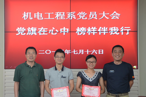 会议由总支宣传委员梁新平同志主持。会上系党总支副书记、系主任代礼前同志宣读了《机电工程系关于表彰2015年优秀共产党员的决定》。大会对获得系级优秀共产党员的郭艳珠、冯小庭两位同志进行了表彰,郭艳珠同志代表受表彰个人发言,做了班主任工作经验事迹介绍。在组织员谷茂庆同志的带领下,全体共产党员在庄严的党旗下重温了入党誓词。