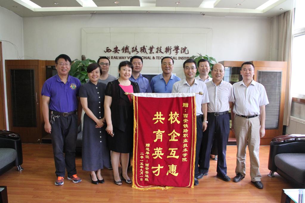9月2日上午,西安铁路局西安客运段副段长潘永胜、劳人科科长杨梅一行专程来校,将一面题有“校企互惠,共育英才”的锦旗和一封热情洋溢的感谢信赠与学院,以感谢我院在2015年暑运工作中提供的大力协助。学院副院长邓耀斌及教务处、相关系部负责人出席赠送仪式。