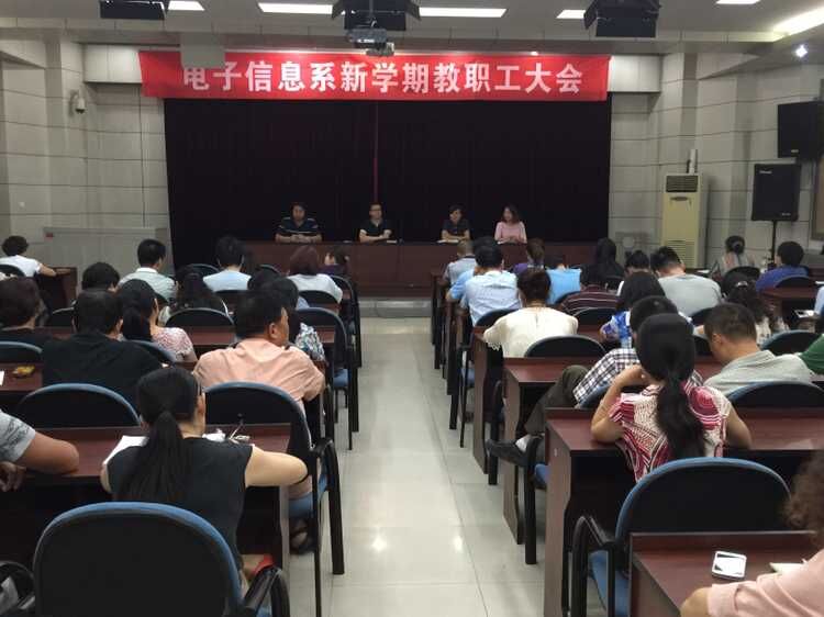 日前,电子信息系全体教职工齐聚大电教召开了新学期教职工大会,大会由系办主任马荣主持。