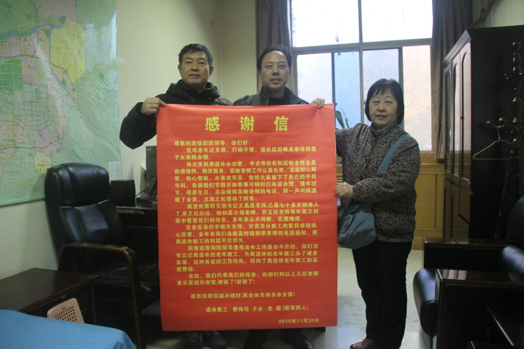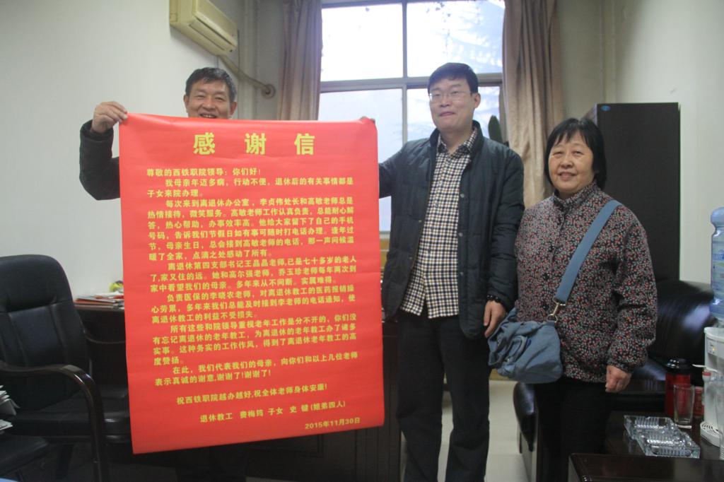 寒风瑟瑟,而离退休管理处办公室却温暖如春。11月30日上午刚上班,我院退休职工费梅筠老师的子女就给学院送来了一封满怀深情的感谢信,表达他们对学院领导和学院有关处室认真工作、热情服务、关心帮助离退休老同志的感激和赞许之情。