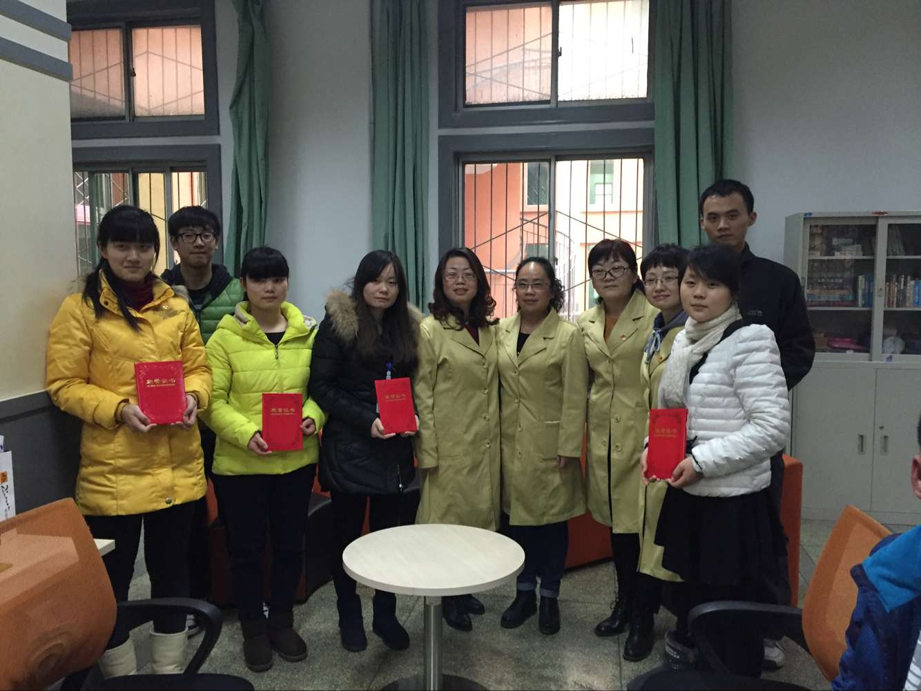 会议后,袁素瑛与相关老师一起为同学们颁发了2016年度图书员聘书、纪念抗战胜利70周年征文活动获奖证书并合影留念。