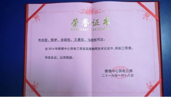 1月26日,深圳地铁公司维修中心供电三部在横岗车辆段开展了首届新员工接触网专业技术比武。我院电气工程系1303班学生马晓辉和王晨阳代表车间比赛获得了三等奖。