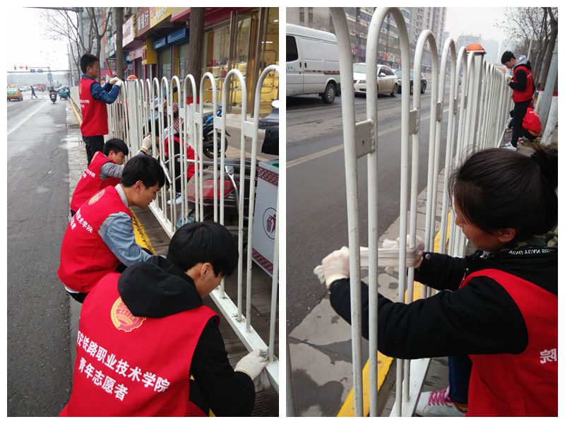 为响应西安市“城市治理专项行动”,建设美丽西安。 3月16日下午,机电工程系团总支在学院团委的统一部署下,组织开展了自强西路纸坊村十字路口公共设施大清扫志愿活动,对十字路口四个方向的人行道护栏、公交站牌及垃圾桶等公共设施进行了彻底清洗。
