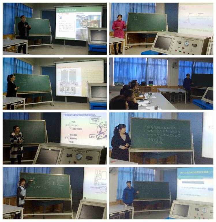 比赛过程中,各参赛选手以充足的准备,展现了良好的教学风貌,展示了多样的教学方法及合理的教学组织。张省伟以提问引入,讲授DK-1型电空制动机的作用原理;马仲智分类讲授一次乘务作业之折返作业;杨会玲讲授HXD3型四象限整流器电路;武欣选取三相异步电动机的工作原理为主要内容进行讲授;张丽娜讲授城市轨道交通车辆电气控制系统概述;柴贵兰讲授信号基础设备——轨道电路;刘凤娟从概述、结构组成和工作原理三方面讲授了空气干燥器;柏承宇讲授基于工作过程的教学设计——电力机车受电弓检查与调试。