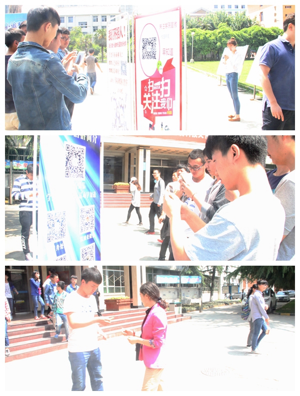 在活动现场,党委宣传部对学院官微及部门已建的二级官微进行宣传推广。通过展板提供简要介绍及微信公众号二维码供学生扫描添加,向围观的学生宣传校园公众号的内容特点,引导学生关注校园公众号,在学生成功添加校园公众号后发给他们活动的纪念品。宣传部在和学生的沟通中还招募吸收擅于摄影、擅于写文章和生活有创意的学生加入微信公众号的工作团队。