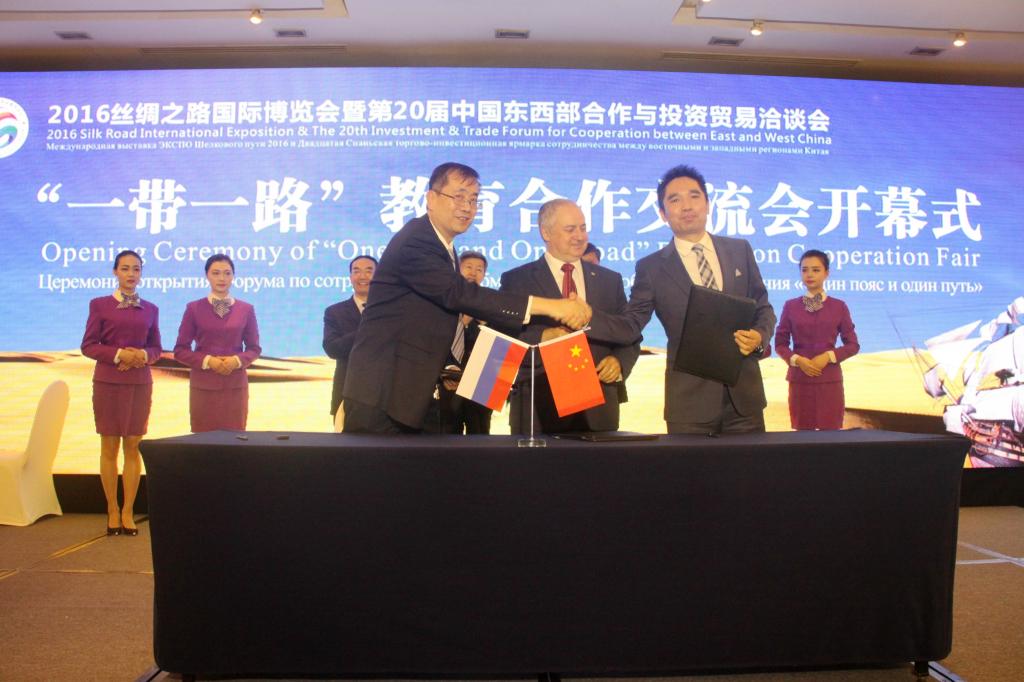 由陕西省教育厅主办的“一带一路”教育合作交流会,是2016丝绸之路国际博览会暨第20届中国东西部合作与投资贸易洽谈会的组成部分,5月13日在西安喜来登大酒店举行。我院院长田和平与圣交大副校长吉谢列夫.伊格尔.巴夫洛维奇、欧亚国际协会会长冯耀武先生在仪式上共同签署了合作办学备忘录。省人大常委会副主任张迈曾、省教育厅厅长王建利、学院党委书记安文中等共同为“国际交通学院”揭牌。至此,我院国际合作办学将步入具体实施阶段。