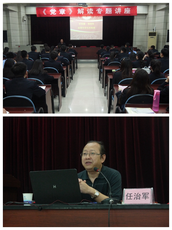 任治军从四个方面为学员进行了讲解。一是党章的地位和作用作用,强调了党章是立党治党管党的总章程;二是党章的历史沿革,以时间为主线为学员们梳理了党章的历程;三是十八大修订党章的主要精神;四是要求学员深入学习党章,做青年学生的楷模。