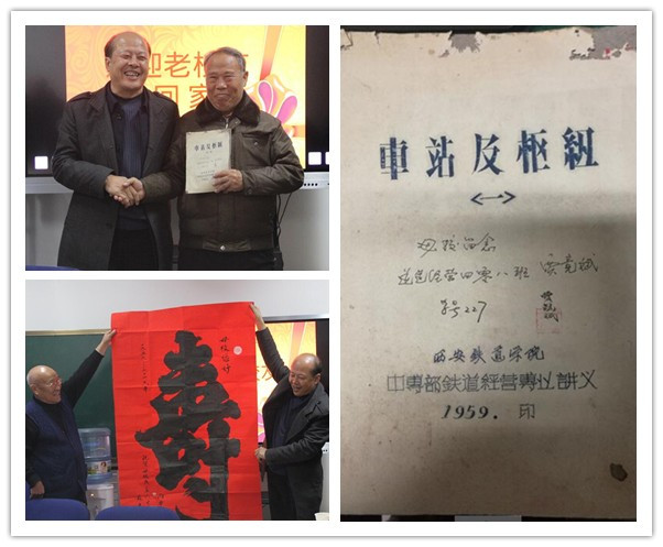 在校园中,他们走走、看看,时不时驻足和90后的学弟学妹们交谈,广场上、花园里、办公楼前,大家不断拍照留念,遥忆当年的青葱岁月;在以“感恩•传承”为主题的校友座谈会上,老校友们仔细聆听了交通运输学院主任韩买良、党总支书记李栋对校情、院情的介绍,当听到母校不断发展壮大和交通运输学院近年各项工作硕果累累时,大家由衷的竖起大拇指并激动的热烈鼓掌。校友们纷纷表达了六十年来对母校培养的感激之情,对当年老师们悉心教育的感恩之心,并对在校学生提出了殷切希望,动情之处已是满眼热泪。校友苏光华为母校献上自己亲手书写的“寿”字;校友贾竞斌捐赠了自己上学时使用过的,从59年完好无损保存至今的校本讲义。这些看起来并不厚重的礼物,因见证了学院六十年的辉煌历史、因承载了老校友们六十年的赤子情怀而弥足珍贵,是学院六十华诞之际收到的无价之宝。六十年的校庆因他们的到来而更加精彩。