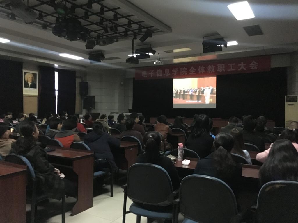 11月16号下午,电子信息学院在自强校区大电教召开了全体教职工大会暨“两学一做”专题教育集中学习,会议由电子信息学院办公室主任马荣主持,全体教职工参与了会议。