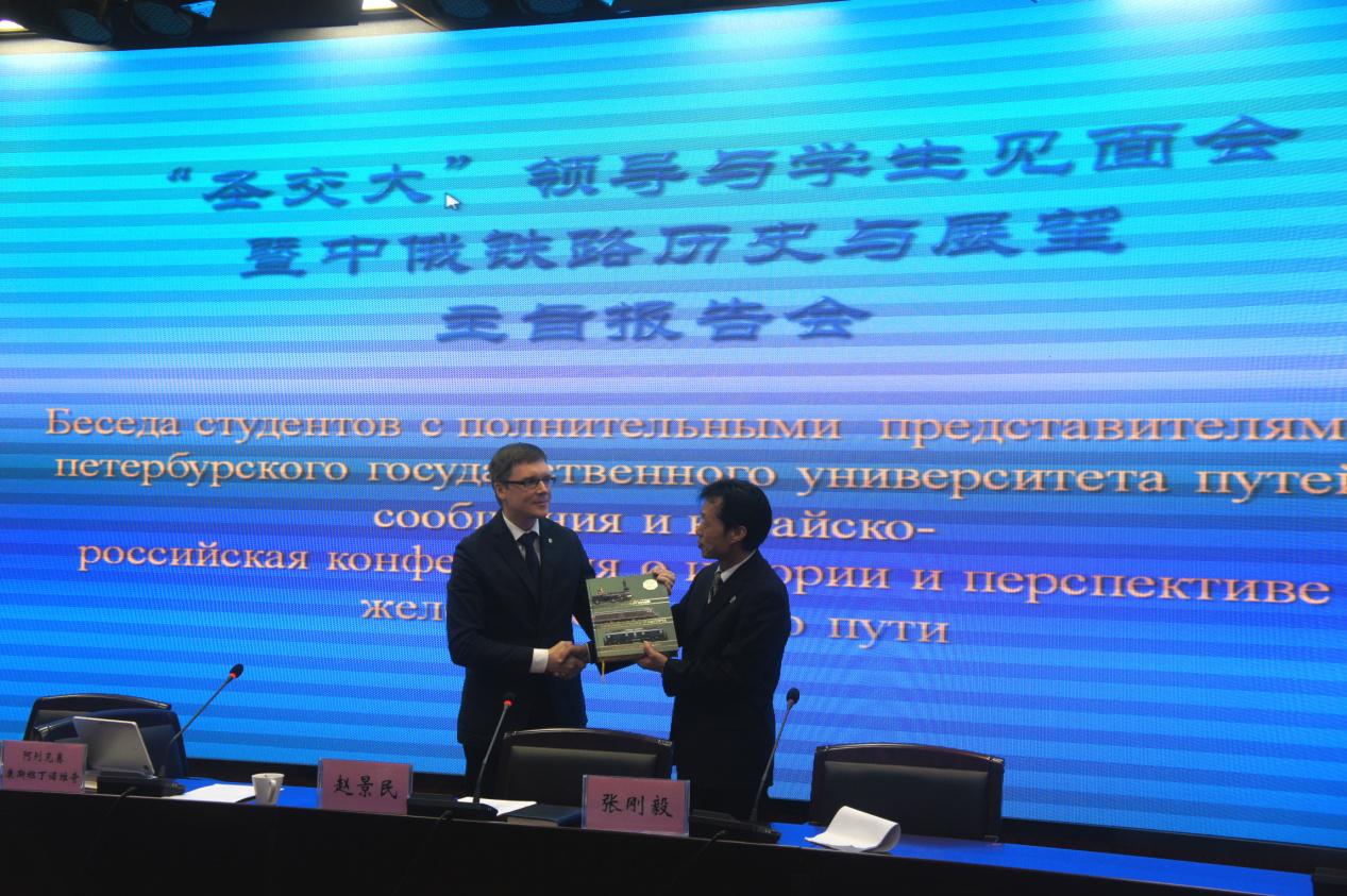 阿列克赛先生在致辞中充分肯定了国际交通学院为学生提供的优雅办学环境和教学条件。介绍了中俄两国在交通领域的密切合作和未来人才需求的美好前景。他表示,将翘首以待,盼望着大家以友好使者的身份,积极投身于两国教育交流的大潮之中。会上,阿列克赛先生代表俄罗斯圣彼得堡交通大学向我院赠送了“俄罗斯铁路交通中心博物馆200周年纪念册”。