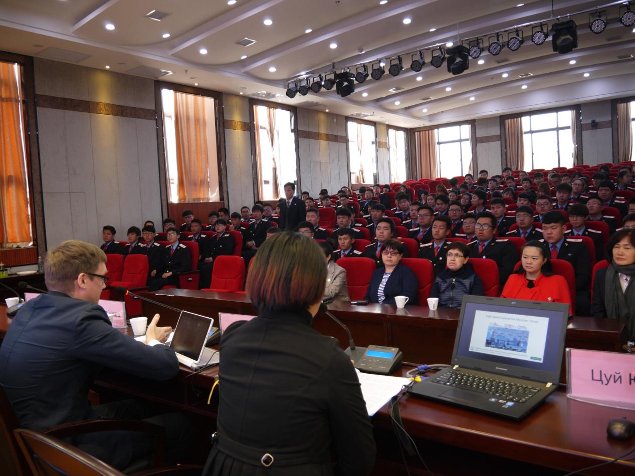 阿列克赛先生在主旨报告中简要回顾了俄罗斯铁路发展历史,围绕莫斯科—喀山—北京高铁,向师生们描绘了“一带一路”壮丽的画卷。他表示,相信两国在轨道交通领域教育和技术的合作将更加深入,同学们今后也将会大有作为。会后与学生进行了互动,就留学的具体问题作了解答。