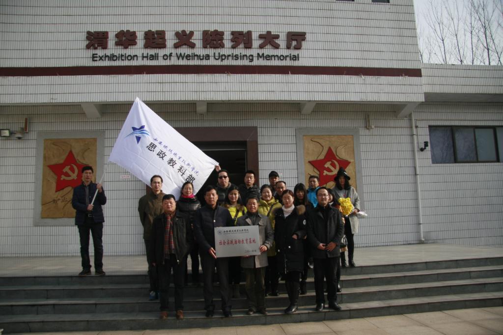 2016年12月23日,学院大学生思政理论课社会实践活动教育基地挂牌仪式在渭南市渭华起义纪念馆举行。渭华起义纪念馆馆长史小宏、书记李晓娟、办公室主任郭伟、学院思政教科部主任景延鹏、毛特与美育教研室主任邢卫红、思法与心理教研室主任王文波及思政部全体教师出席了挂牌仪式。