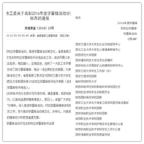 为进一步深化拓展岗位学雷锋活动,推进学雷锋活动常态化,省委高教工委在全省高校开展了2016年度学雷锋活动示范点和岗位学雷锋标兵评选命名工作。我院团委做为18个“2016年度学雷锋活动示范点”之一,受到表彰。