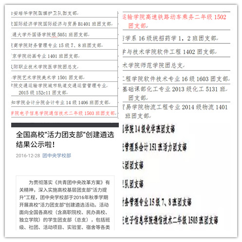 为贯彻落实《共青团中央改革方案》有关精神,深入实施高校基层团支部“活力提升”工程,团中央学校部于2016年秋季学期开展高校“活力团支部”创建遴选活动。经过院内创建、遴选,团省委、团中央评审、网络投票等环节,最终我院电子信息学院通信技术1503团支部和交通运输学院高速铁路动车乘务1502团支部获评全省高校共青团“百佳活力团支部”称号,电子信息学院通信技术1503团支部获评全国高校“活力团支部”称号。