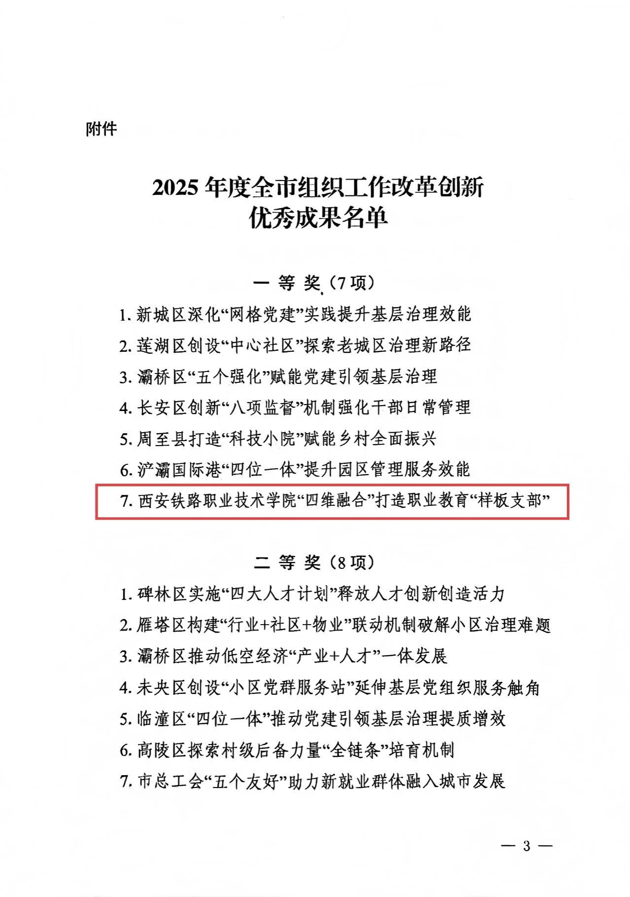 近日,西安市委组织部发布了《关于2025年度全市组织工作改革创新优秀成果的通报》(市组通字〔2026〕7号),我院申报的《“四维融合”打造职业教育“样板支部”》项目获得“2025年度全市组织工作改革创新项目”一等奖。