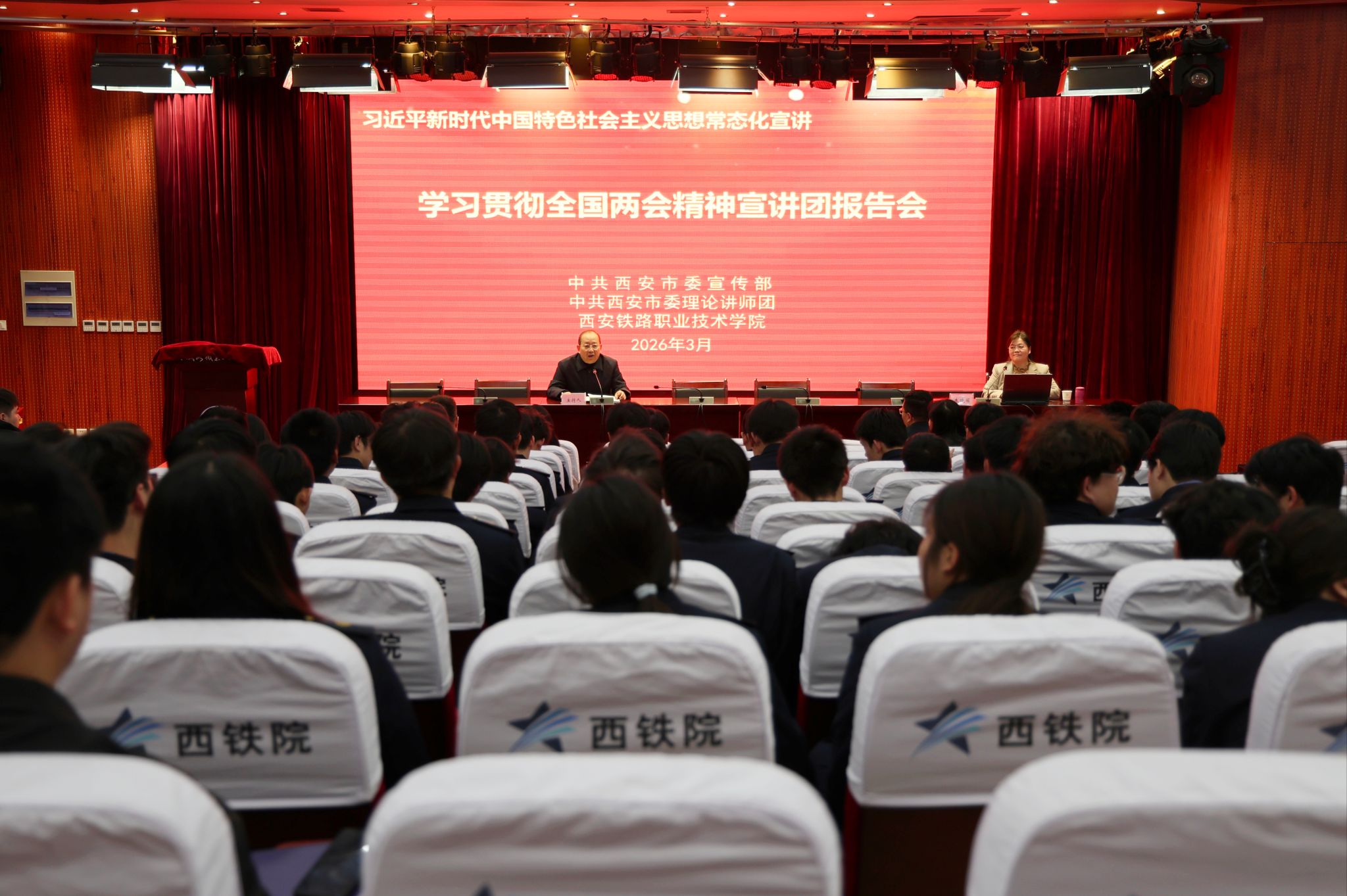 任治军在主持报告会时表示,2026年全国两会是在“十四五”规划收官之年、进一步全面深化改革的重要一年召开的一次十分重要的会议。学习贯彻好两会精神,是当前和今后一个时期的重要政治任务。他希望全体师生,一是深学细悟,筑牢思想根基,切实把思想和行动统一到党中央决策部署上来;二是深耕专业技能,练就过硬本领,紧扣职业教育高质量发展要求,弘扬工匠精神,努力成为高素质技术技能人才;三是厚植家国情怀,勇担时代使命,将青春奋斗融入中国式现代化建设,为服务区域经济社会和行业企业发展贡献西铁院力量。