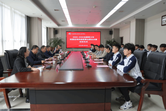 4月3日上午,西安铁路职业技术学院2025—2026全国青少年校园足球四级联赛全国总决赛出征仪式,在港务校区办公楼五楼第三会议室举行。