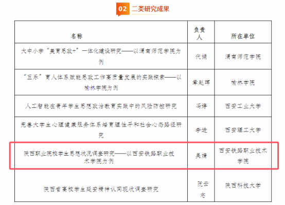 近日,省委宣传部、陕西省思想政治工作研究会公布2025年度陕西省思想政治工作研究成果入选名单。由学院党委宣传部、马克思主义学院联合完成的研究成果《陕西职业院校学生思想状况调查研究——以西安铁路职业技术学院为例》荣获二类优秀研究成果,为全省唯一入选的高职院校。