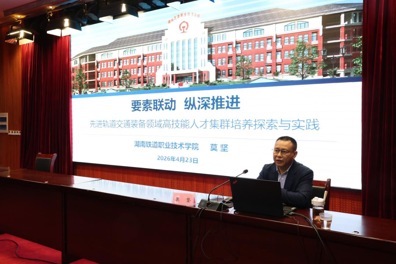 下午,学院特邀湖南铁道职业技术学院机车学院院长莫坚教授作了题为《要素联动 纵深推进——轨道装备领域高技能人才集群培养探索与实践》的专题报告,为学院纵深推进职业教育教学关键要素改革提供了宝贵借鉴。随后举行了校企专家座谈会,共商人才培养大计。