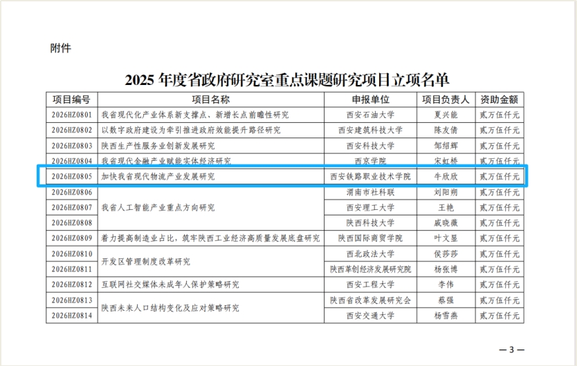 近日,陕西省哲学社会科学研究专项 2025 年度省政府研究室重点课题立项结果正式公布。土木工程学院牛欣欣教授主持的《加快我省现代物流产业发展研究》成功获批立项,学院成为本次全省唯一获批立项的高职院校。