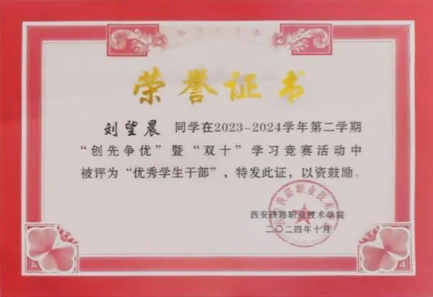 肖佳晨,土木工程学院高速铁路施工与维护专业2301班学生,共青团员。上一学年个人成绩专业第二。担任班级学习委员,学生会学习部部长。荣获国家励志奖学金、三好学生、优秀学生干部、年级学习标兵等荣誉。细心沉稳、善于沟通、乐于帮助同学、随机应变能力强,多次参与各类竞赛和学校组织的志愿者活动。