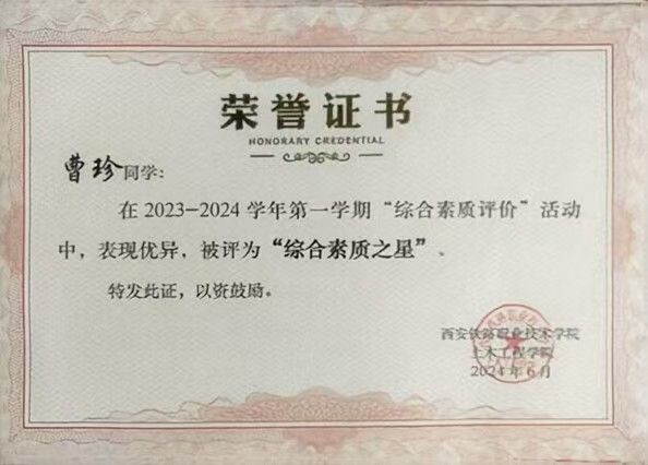 曹珍,土木工程学院铁道工程技术专业2302班学生,共青团员。在校期间努力学习,担任班级学习委员,学院广播站副站长,在“全国大学生数学建模竞赛”省赛中获得一等奖。荣获三好学生、年级学习标兵、优秀学生干部等荣誉,不仅在学业上追求卓越,还积极参与各类校园活动,提升综合素质。