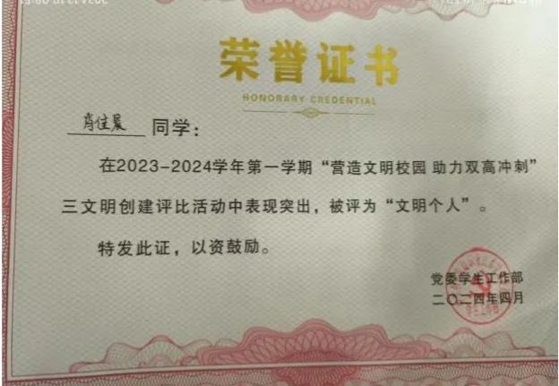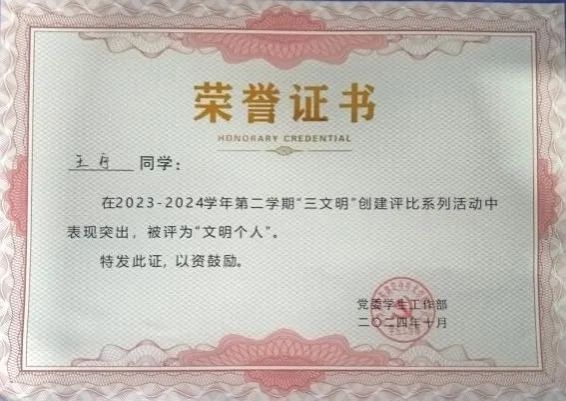 能够获得此次国家励志奖学金我深感荣幸,也让我更加坚定信念。它将助力我购买更多的学习资料,提升自我。未来,我会以更饱满的热情投入学习,积极参与科研项目与社会实践,提升综合能力,用所学回馈社会,为那些如我曾经般在困境中奋斗的学子树立榜样,让这份励志的力量传递下去。