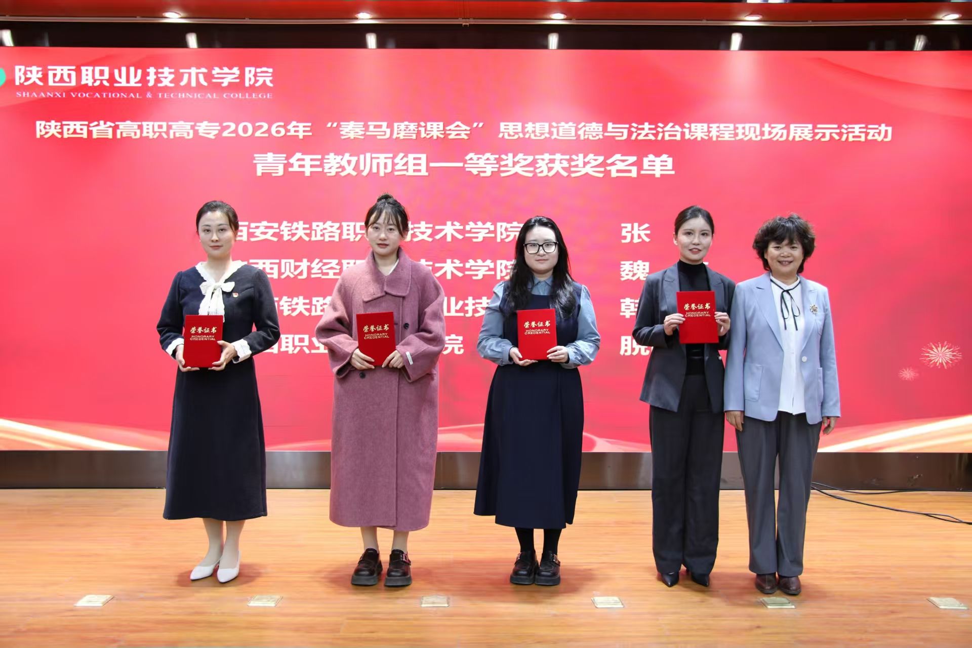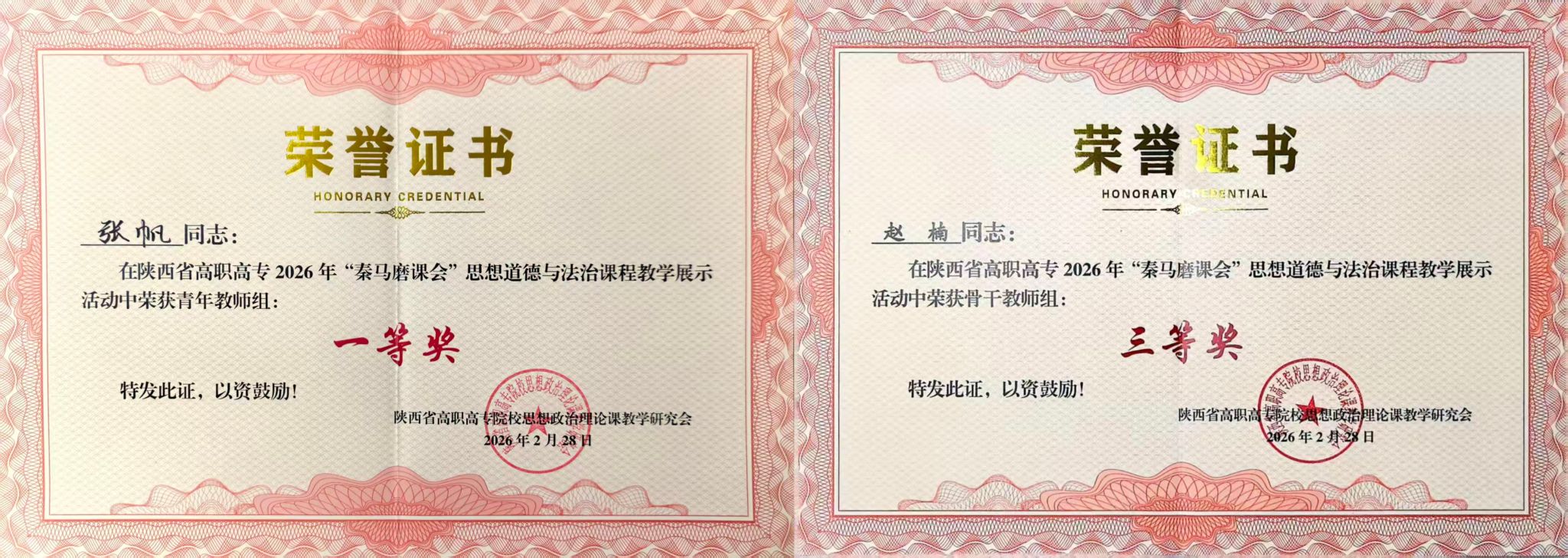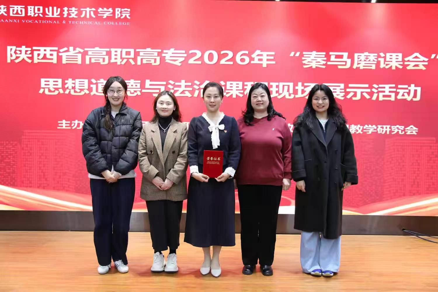 2月28日,陕西省高职高专2026年“秦马磨课会”思想道德与法治课程教学展示活动在陕西职业技术学院圆满落幕。我院马克思主义学院教师凭借扎实的教学功底和出色的现场表现,在众多参赛选手中脱颖而出,教师张帆荣获青年组一等奖,教师赵楠荣获骨干组三等奖,充分展现了我院思政课教师队伍的风采与实力。