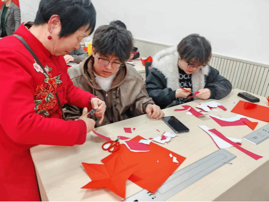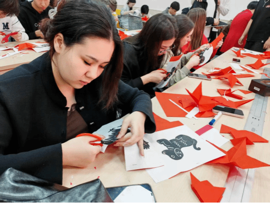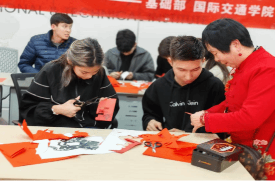 在活动现场,魏鲜丽老师围绕剪纸的历史渊源、民俗寓意与传统技法进行生动讲解,从折纸、勾线到剪刻、镂空,一步步示范操作要点,将传统技艺转化为沉浸式体验。同学们凝神聆听、动手实践,用剪刀与红纸创作出福字、窗花、吉祥纹样等饱含民俗韵味的作品。国际交通学院中外学生积极参与其中,在亲身体验中感受中华传统文化的独特魅力,以剪纸为纽带,搭建起中外文化交流的桥梁。现场氛围温馨而热烈。