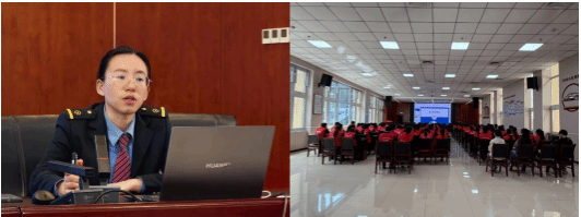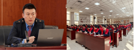 车站工作人员坐在台前,结合PPT对客运基础规章进行讲解,内容涵盖客运、票务、安全、管理等多项规定。通过旅客赔偿、列车停运、改签、退票等真实案例,讲解了责任界定、合同关系、费用处理等实际问题,强调自然灾害与企业责任的区分原则。同学们微微前倾身体,认真聆听客运规范管理的细则,部分人还相互轻声交流,梳理规章中的关键管理要求。