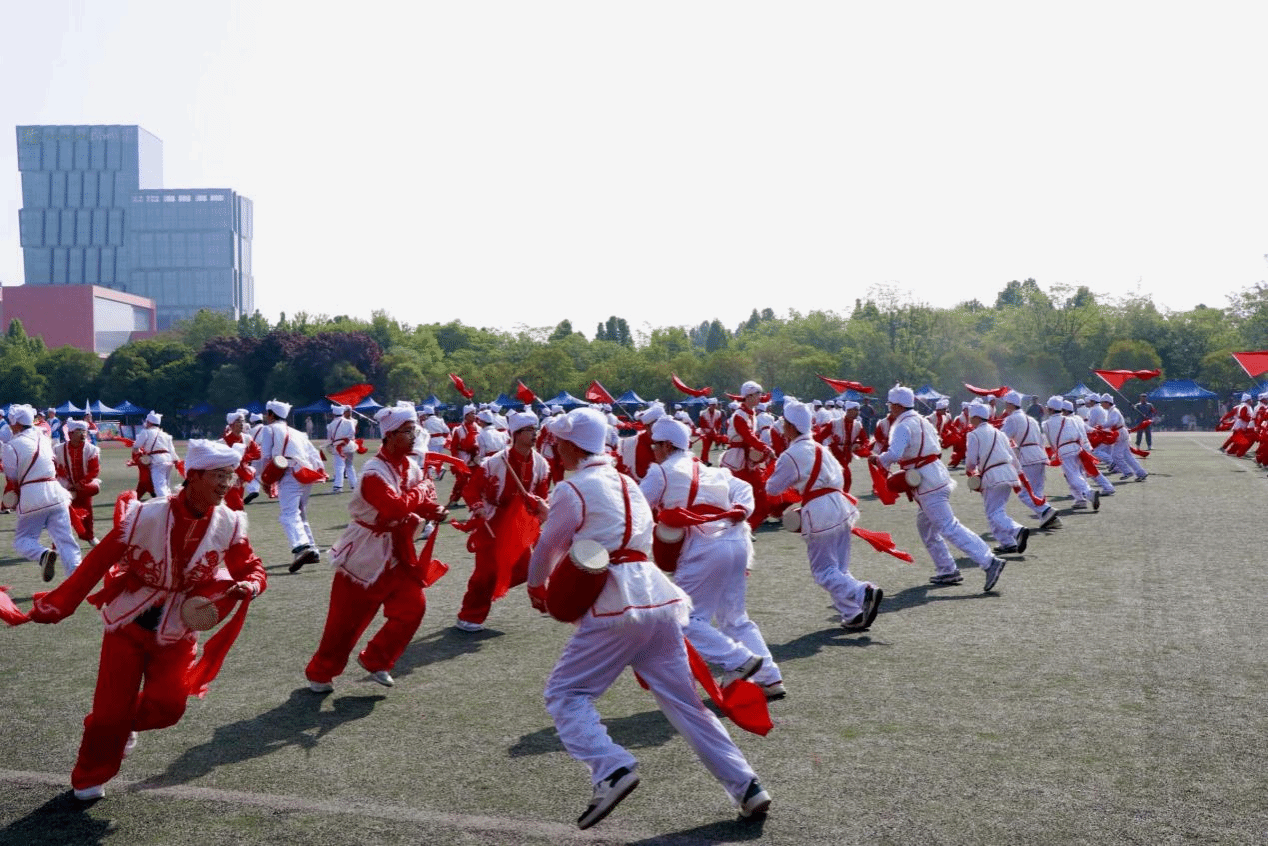 方队过后,本届运动会开幕式唯一的开场表演——非遗文化节目《鼓韵传承》震撼登场。由270余名机电学子组成的安塞腰鼓队与秧歌队红衣如火、红绸如焰,鼓槌起落之间,雄浑鼓声如万马奔腾,顷刻间点燃整片绿茵场,成为当之无愧的最亮眼篇章。