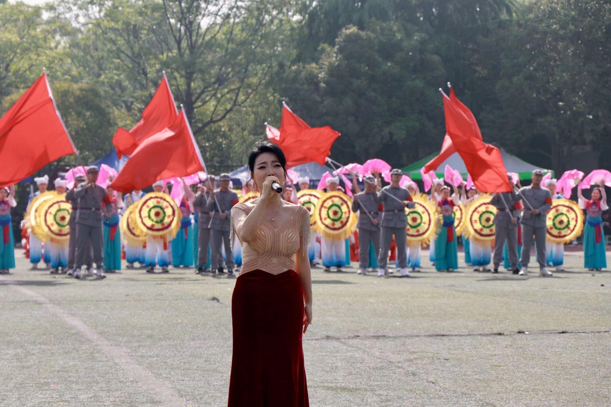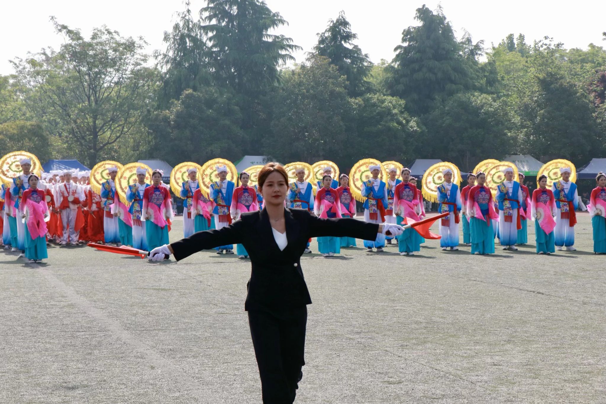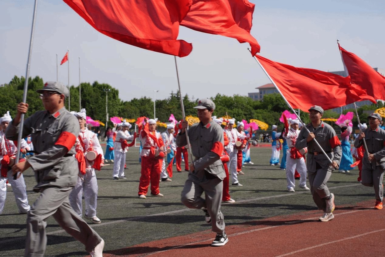 伴随着欢快的节奏,陕北大秧歌翩然起舞。舒展有力的身姿、热烈奔放的舞步,既是对革命老区人民乐观向上精神的致敬,也是对青春力量的最美礼赞。四个三角形方阵巍然挺立,环绕中央秧歌,刚柔相济、气象万千,象征着机电学子团结一心、众志成城的集体品格。红旗猎猎,信仰闪耀,鲜艳的红旗迎风飞扬,圆阵如齿轮咬合,尽显机电工程学院严谨精工、协同运转的专业精神。红旗所指,初心如磐;鼓声所至,使命在肩。