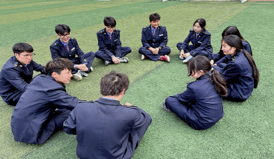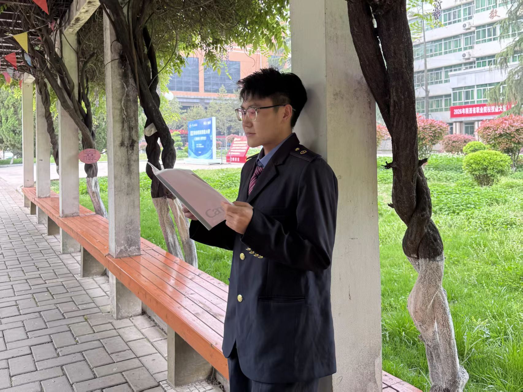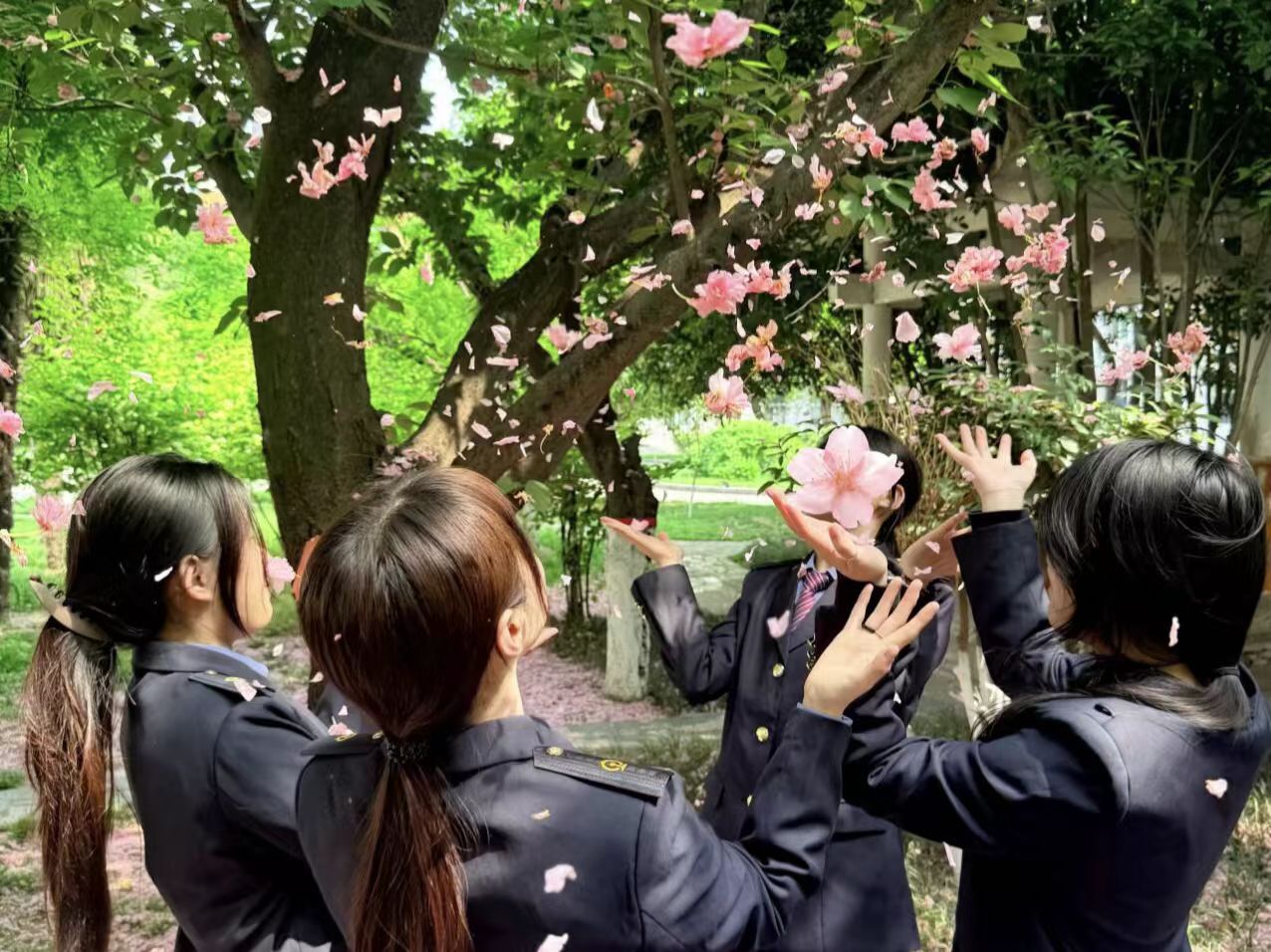 现代通信2502团支部的团员身着制服在樱花校园里共读红色经典与专业书籍、交流学习心得,在书香与春光中坚定理想信念、凝聚青春力量。